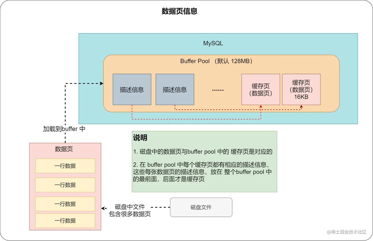 BufferPool中的数据页一般我们叫缓存页,默认情况下缓存页与磁盘上的数据页大小是对应的 - 对于每个缓存页都有一个描述信息