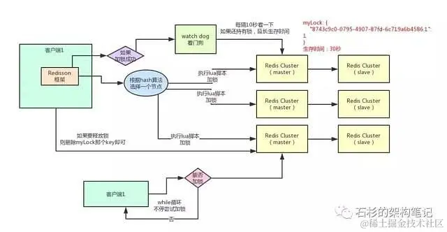 好的,接下来就通过一张手绘图,给大家说说Redisson这个开源框架对Redis分布式锁的实现原理。