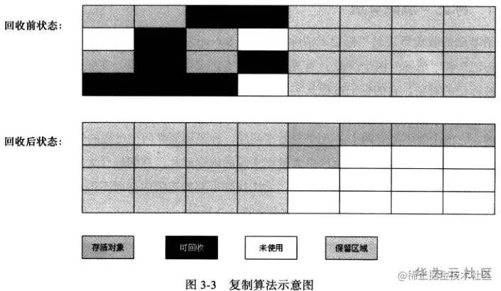 为了解决效率问题,一种称为”复制“的收集算法出现,它将可用内存按容量划分为大小相等的两块,每次只使用其中的一块。当这一块的内存用完了,就将还存活的对象复制到另外一块上面,然后再把已使用过的内存空间一次清理掉。这样使得每次都是对整个半区进行内存回收,内存分配时也就不用考虑内存碎片等复杂情况,只要移动堆顶指正按顺序分配内存即可,实现简单,运行高效。只是这种算法的代价是将内存缩小为原来的一般,未免太高了一点。