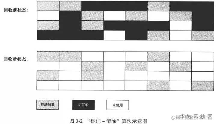 主要不足有两个:一是效率问题,标记和清除两个过程的效率都不高;另一个是空间问题,标记清除之后会产生大量不连续的内存碎片,空间碎片大多可能会导致以后再程序运行过程中需要分配较大对象时,无法找到足够的连续内存而不得不提前出发另一次垃圾收集动作。