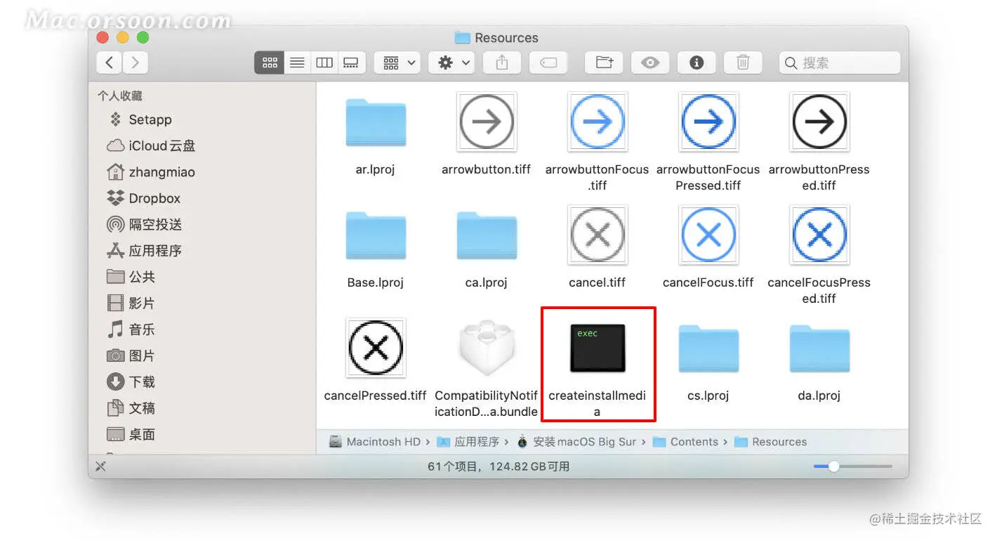 macOS Big Sur 的安装文件下载完成后会自动打开,注意不要去执行它的安装。可以按住 command 键,点击一下程序坞上的 macOS Big Sur 安装程序的图标,就可以在访达里快速找到安装文件。在安装文件的图标上点击右键,选择「显示包内容」,进 入 Contents > Resources 文件夹,找到 createinstallmedia文件,我们需要用它来制作安装启动盘。