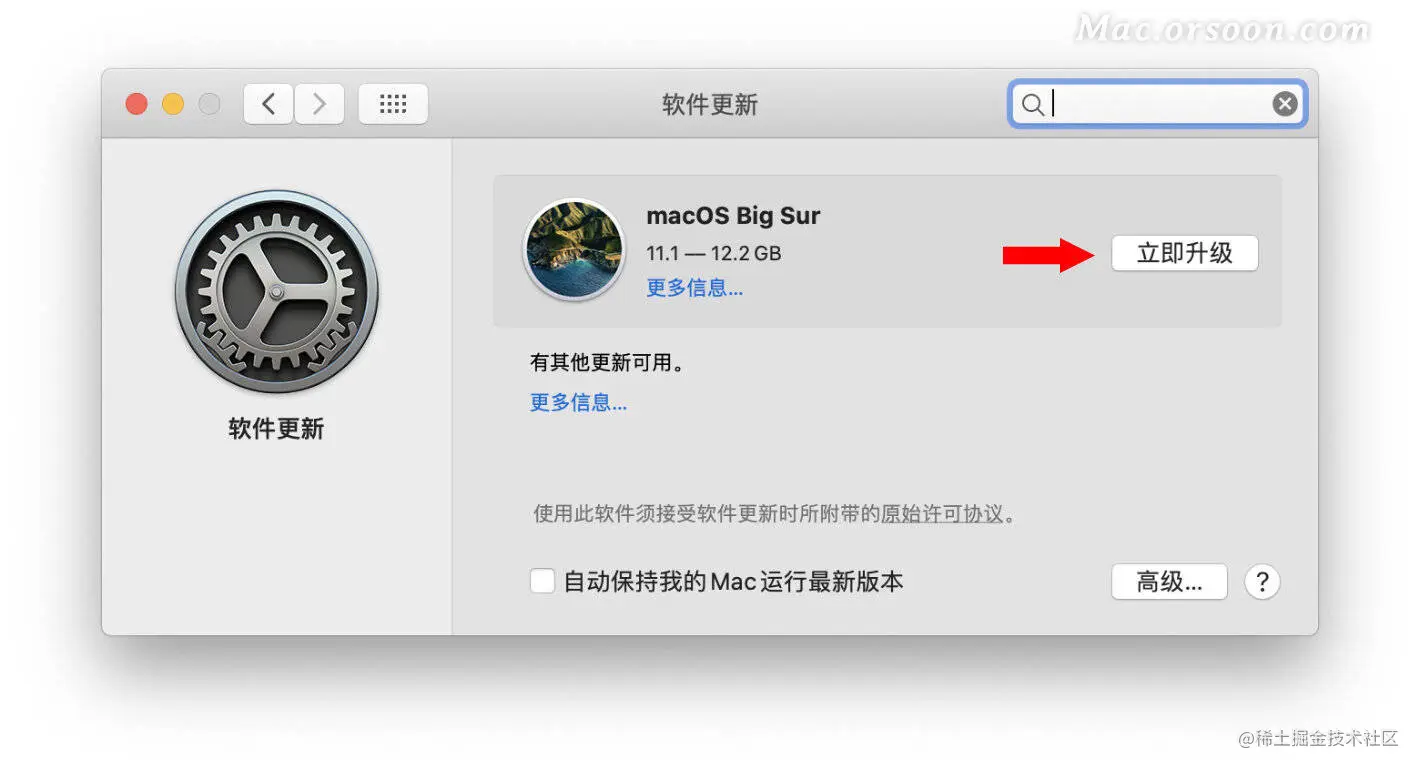 - 如果系统里没有 macOS Big Sur 的安装文件,可以进 入「系统偏好设置-软件更新」,在这里检查是否有 macOS Big Sur 的升级提示。如果出现升级提示,可以选择「立即升级」。这样就可以自动下载 macOS Big Sur 的安装文件。