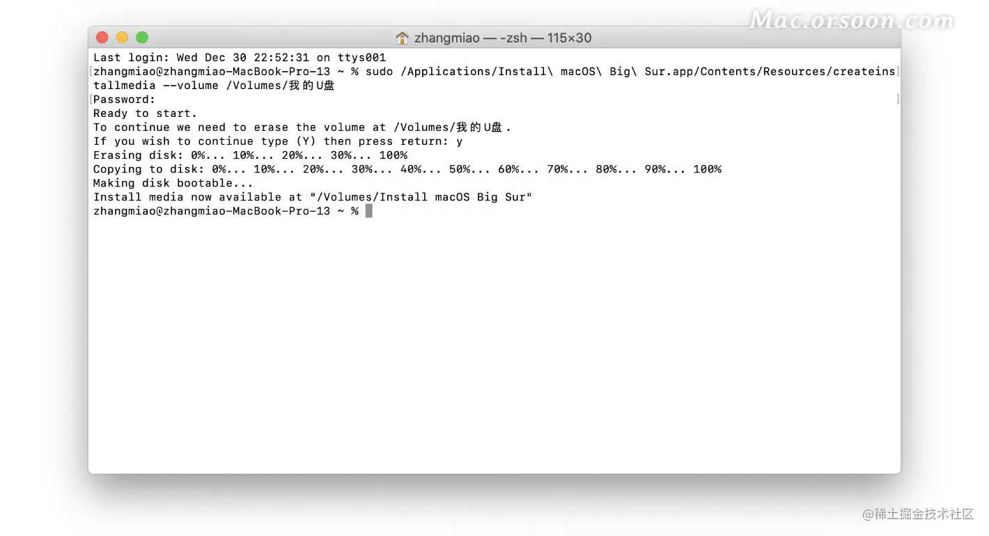 注意:请使用自己的 U 盘名称替换这条命令最后的「Untitled」,然后按下回车键执行命令。接下来,系统会提示输入管 理 员的密码(Password)。密码输入的过程,终端窗口不会显示任何内容。输入完成之后按下回车键,密码验证通过之后,系统会再次提示,为了制作启动盘,将删除 U 盘中的全部内容,确认继续请输入 Y 键,然后按下回车键。稍等片刻,就得到了可以用来引导并安装 macOS Big Sur 系统的启动盘。