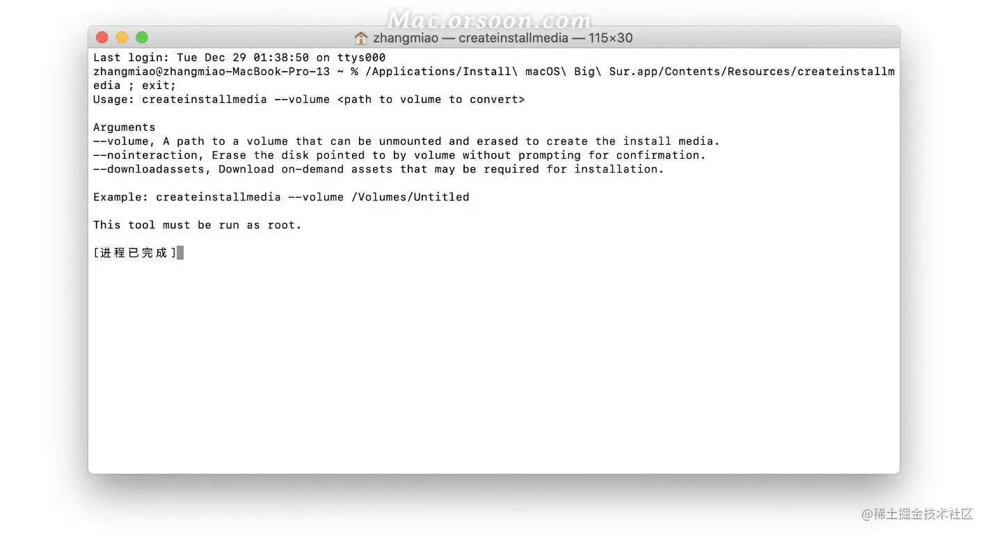 双击 createinstallmedia 文件,它会自动打开「终端」程序,给出一串提示之后,终端窗口显示「进程已完成」。实际上,createinstallmedia 是一个终端命令文件,必须在终端窗口中,按照它给出的提示来执行才能进行安装盘的制作。