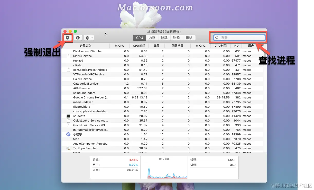 1.打开“活动监视器”,然后在“ CPU”选项卡下找到coreaudiod进程。