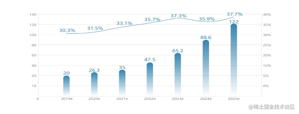 RTC 实时音视频会成为5G 时代基础设施的核心控制点,RTC 应用很广泛,它的市场年增长率超过30%,而且这项技术不仅能赋能直播、游戏等泛娱乐行业,更能在在线医疗、教育、金融等大视频行业渗透。