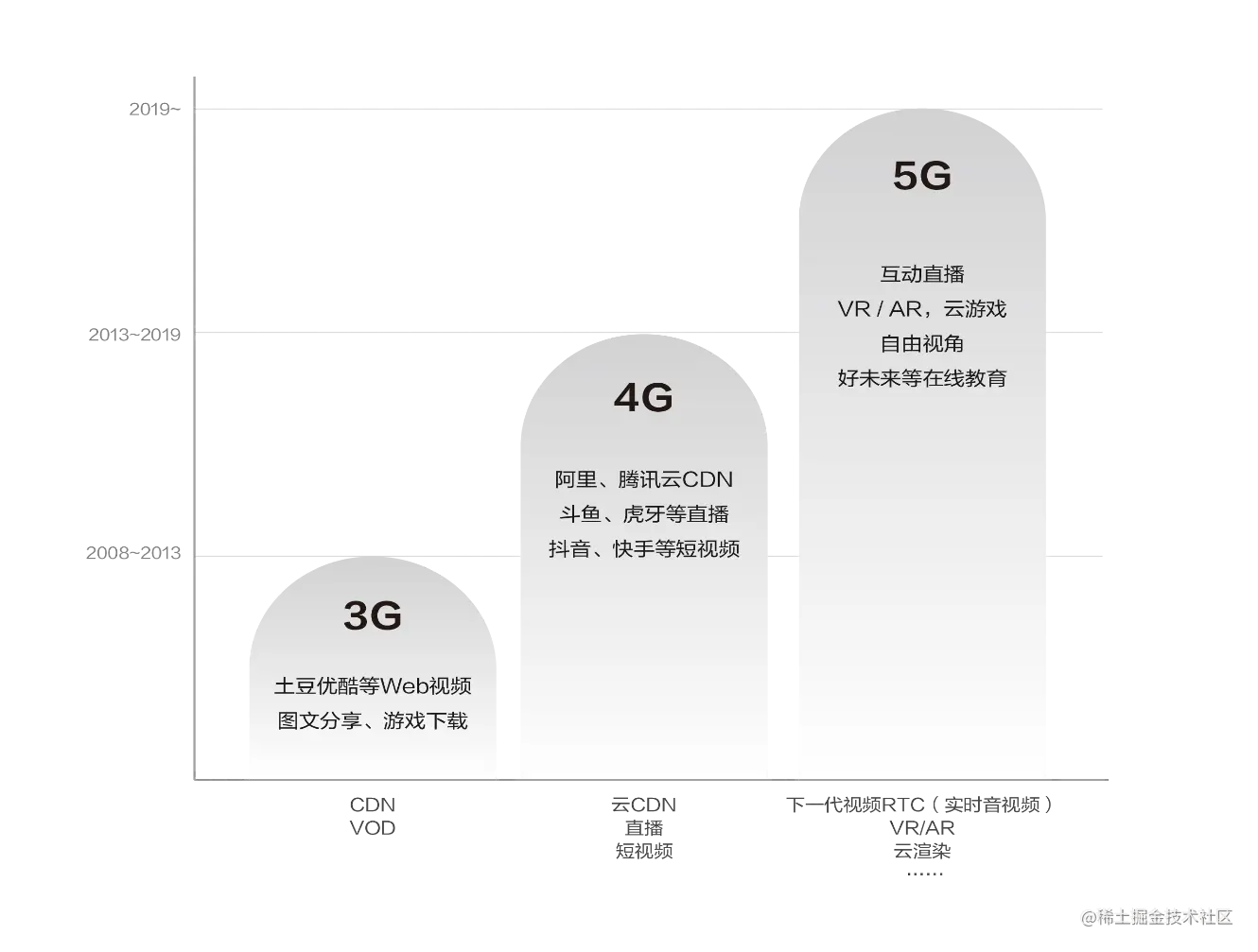 前面说的是行业的整体趋势,下面说一下具体场景。互联网视频发展已经历了两个阶段,第一阶段从08 年到13 年,以长视频VOD、点播观看为热点;第二阶段,从13 年到19 年,也就是去年,其实还在延续,以直播、短视频为热点;第三阶段,也就是下一代,会以什么为热点? 我们认为因为5G、云、AI 的推动,视频将进入实时互动、VR/AR 时代。