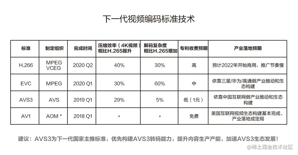 AVS3 是国内提出的标准,它的phase1 是瞄准H.266 标准的,并且在2019 年3 月份就已经制定完成率先推出,在2019 年9 月份,华为海思也同步推出了AVS3 8K 的解码芯片,AVS3 相对H.265 性能提升了20% 以上,并且针对娱乐视频和监控视频做了很多针对性的设计,性能上还可进一步提升。