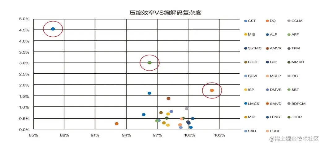 图中还有三个用红圈标出来的工具,这是VVC 中公认trade off 比较好的三个工具点。蓝色的是ALF,这是大家比较熟悉的自适应环路滤波,其实它在H.265的时代就已经有了, H.266 将它引入标准中;绿色的是仿射运动预测,这个主要是由华为提出的;橙色的是量化技术。