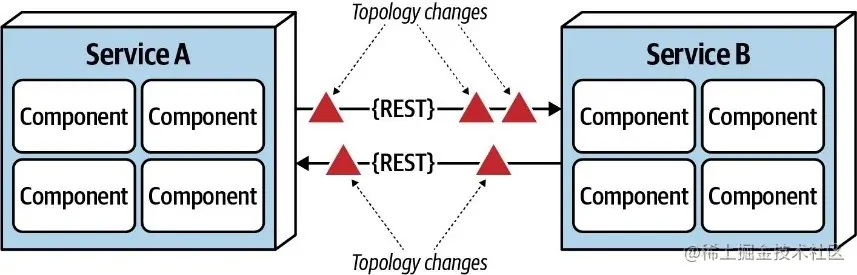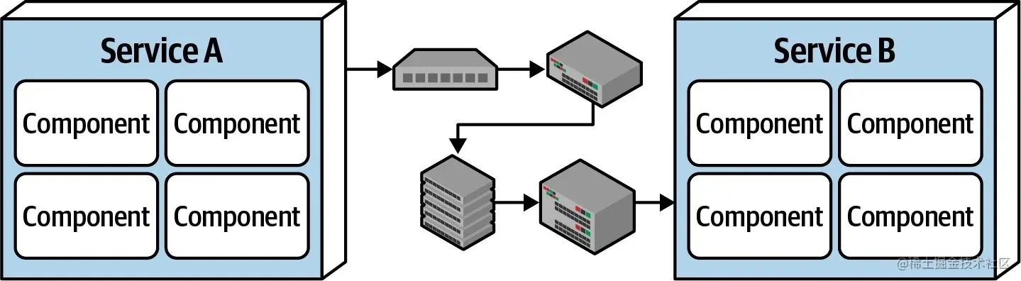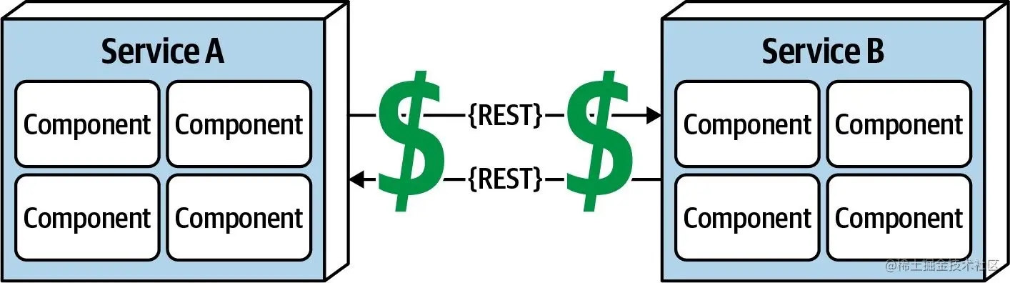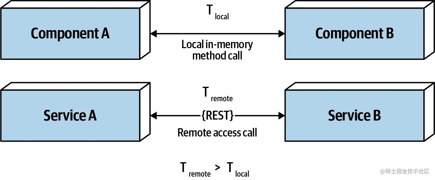 如上图所示,服务内组件间的函数/方法级别的调用,耗时是微秒,甚至是纳秒级别;但是服务间的远程调用(比如REST、消息队列、RPC),耗时会是毫秒级别,甚至在异常场景会达到了秒级!在设计系统,特别是分布式系统时,时延是一个无法被忽视的因素,我们必须清楚系统的平均时延,否则设计出来的方案可能根本不可行。比如,假设系统中服务间通信时延为100ms,如果一个请求的调用链涉及到10个服务,那么该请求的时延将会是1000ms!这么高的平均时延对于一般系统来说是完全无法接受的。