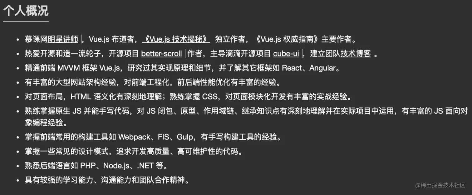 为了让大家能更有体感的知道一份优秀的简历是什么样的,我摘选了社区里大佬们公开的简历中的一些片段: