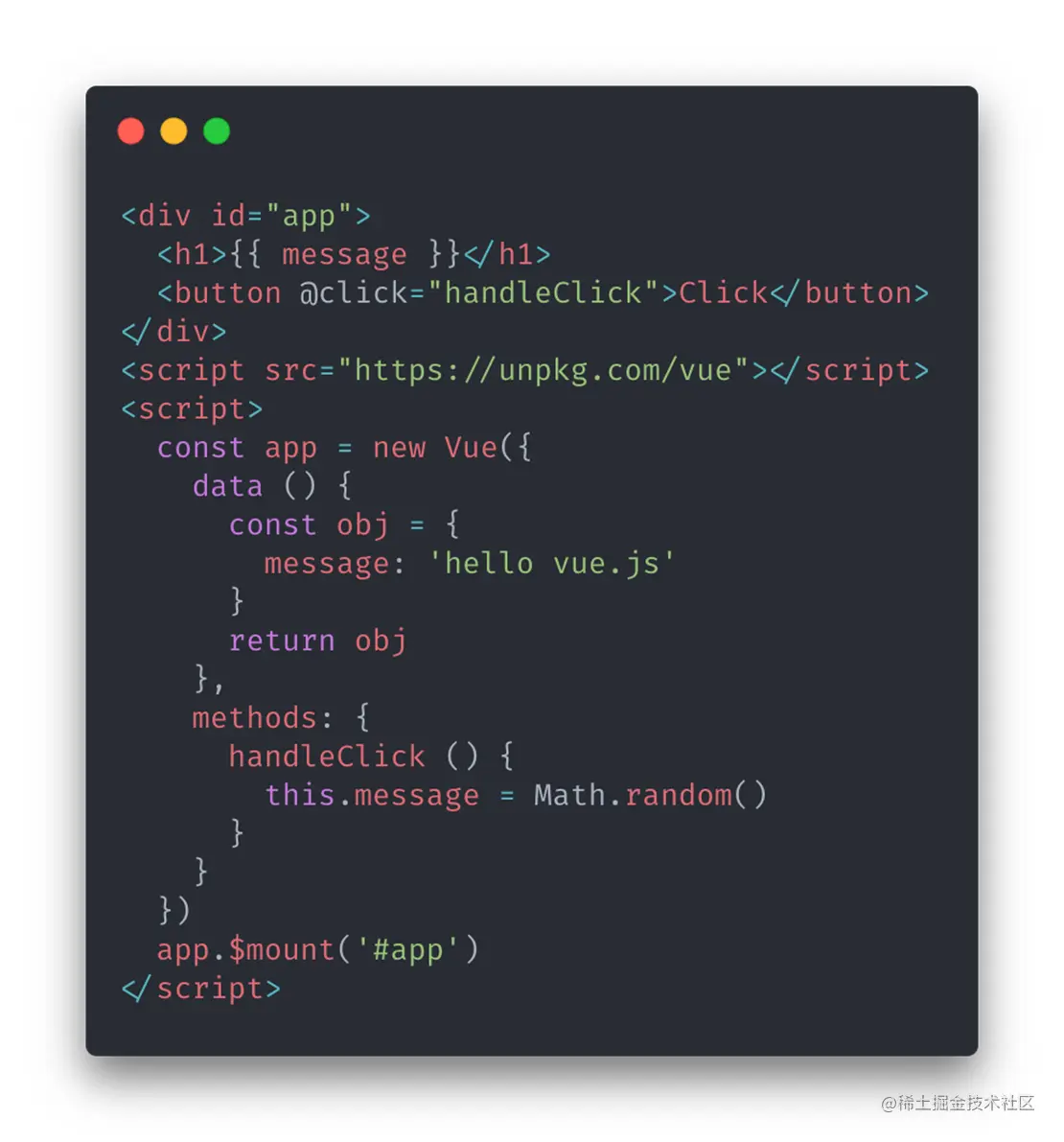 data 中的 obj 就是一个普通的 JavaScript 对象,通过点击 Click 按钮,将获取到的随机数赋值给 this.message ,而 this.message 指向的就是 data 中 obj 对象的 message 属性;当message 发生数据改变时,页面中 H1 标签的内容会随之改变,这个过程就是就是响应式的;那么Vue 是如何实现的呢?