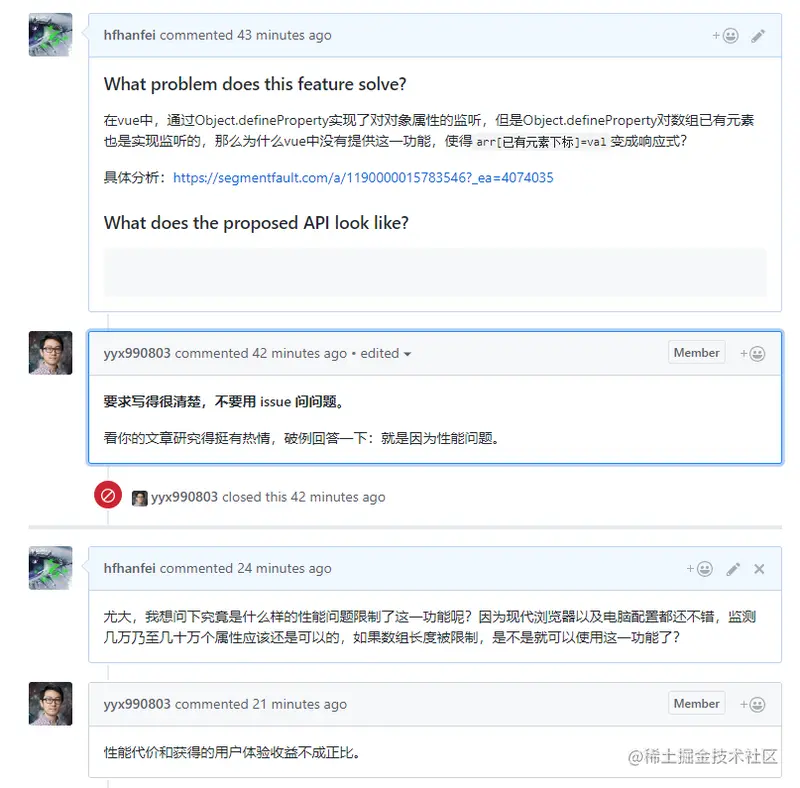 其核心点在于 defineProperty 不能很好的实现对数组下标的监控,而在 Vue2 的实现代码中,没有更好的方案对此进行改善,尤大索性直接放弃了实现;关于这个问题,尤大也在 github 做过回应,截个图给大家看看;