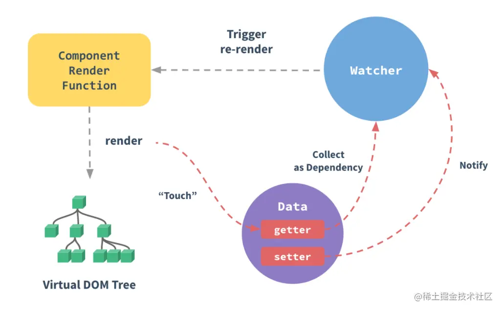 每个组件实例都对应一个 watcher 实例,它会在组件渲染的过程中把“接触”过的数据 property 记录为依赖。之后当依赖项的 setter 触发时,会通知 watcher,从而使它关联的组件重新渲染。