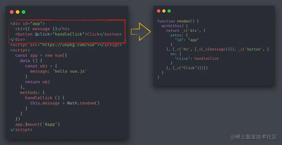 首先,Vue 内部使用 Object.defineProperty() 将 Data 中的每一个成员都转换为 getter / setter 的形式;getter 用来依赖收集,setter 用来派发更新;而模板内容,最终会被编译为 render 函数,在 render 函数中,我们能发现 _v(_s(message)) message 被访问了,就会触发 getter 来进行依赖收集,而在代码中的点击事件中,一旦事件处理程序被触发执行,那么 message 则会被修改,就会触发 setter来进行派发更新;