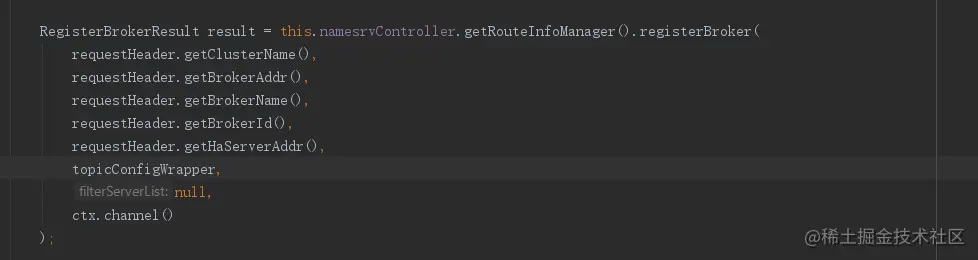 broker启动的时候,namesrv会接收broker的register请求,DefaultRequestProcessor.processRequest()方法根据请求类型进行不同的处理。register时最终会走下入所示的registBroker()方法。该方法会将broker节点信息更新至namesrv的几个容器之中。后续的路由信息都是从容器内获取。