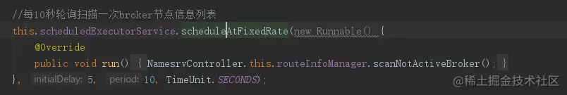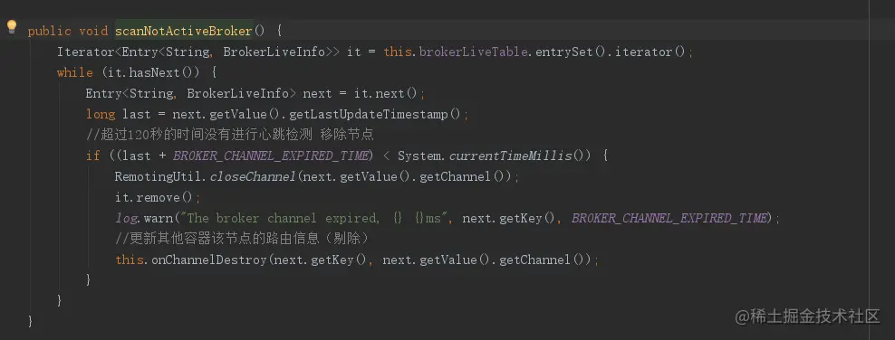3.start方法会创建一个定时任务线程移除过期节点。遍历检查brokerLiveTable(存储broker的心跳版本信息)容器中元素的最后更新时间戳信息,过期移除