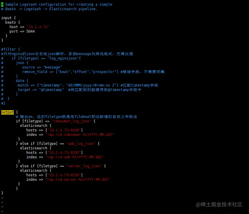 2.如图,修改logstash配置,input的部分要与filbeat中的端口一致 默认5044(随意),filter的部分针对不同的日志内容做不同的预处理或解析,output中对不同的日志输出到不同的es的索引中。图中的filetype就是下面的filebeat中新增的自定义字段;