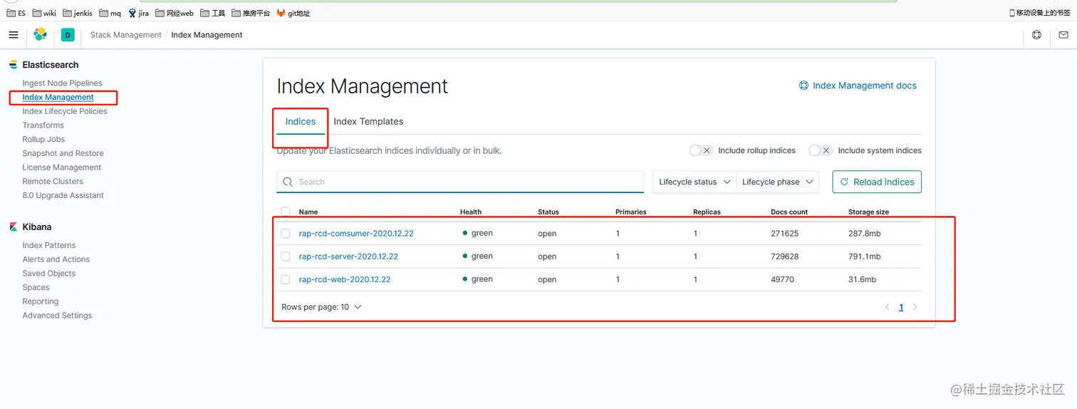 在Kibana中可以看到两个索引已经建出来了并同时写入了不同的日志内容: