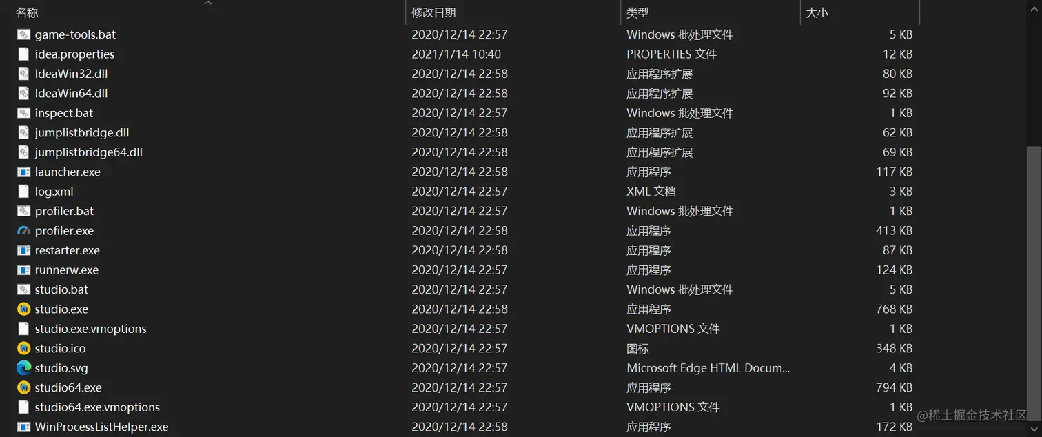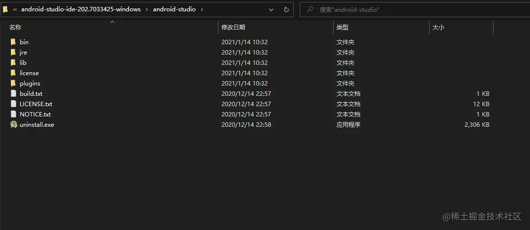 绿色部分配置所在路径,根据个人喜好配置即可,我是把路径放在了解压后的Android Studio的目录中,注意红色部分{user.home}就是绿色部分配置的路径,红色部分模式是用#注释的,要生效配置需要把前面的#去掉,修改后保存退出,在bin目录中最后面就有程序启动入口:studio.exe或者studio64.exe