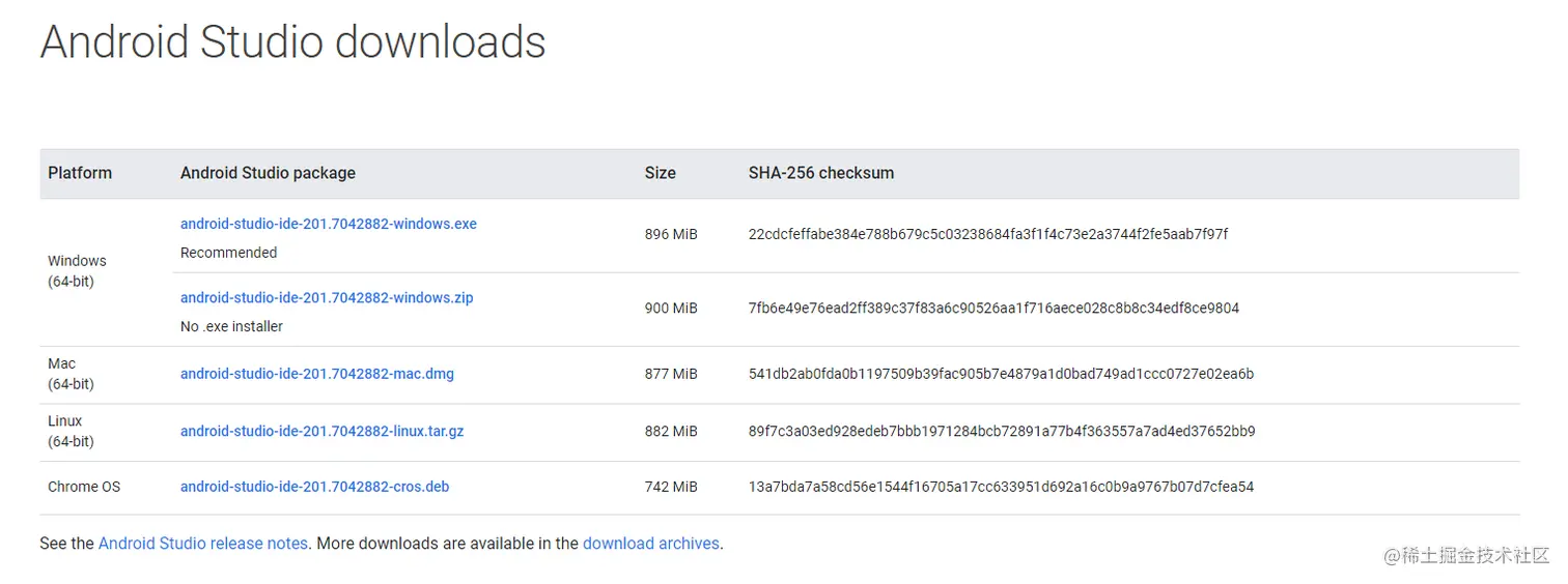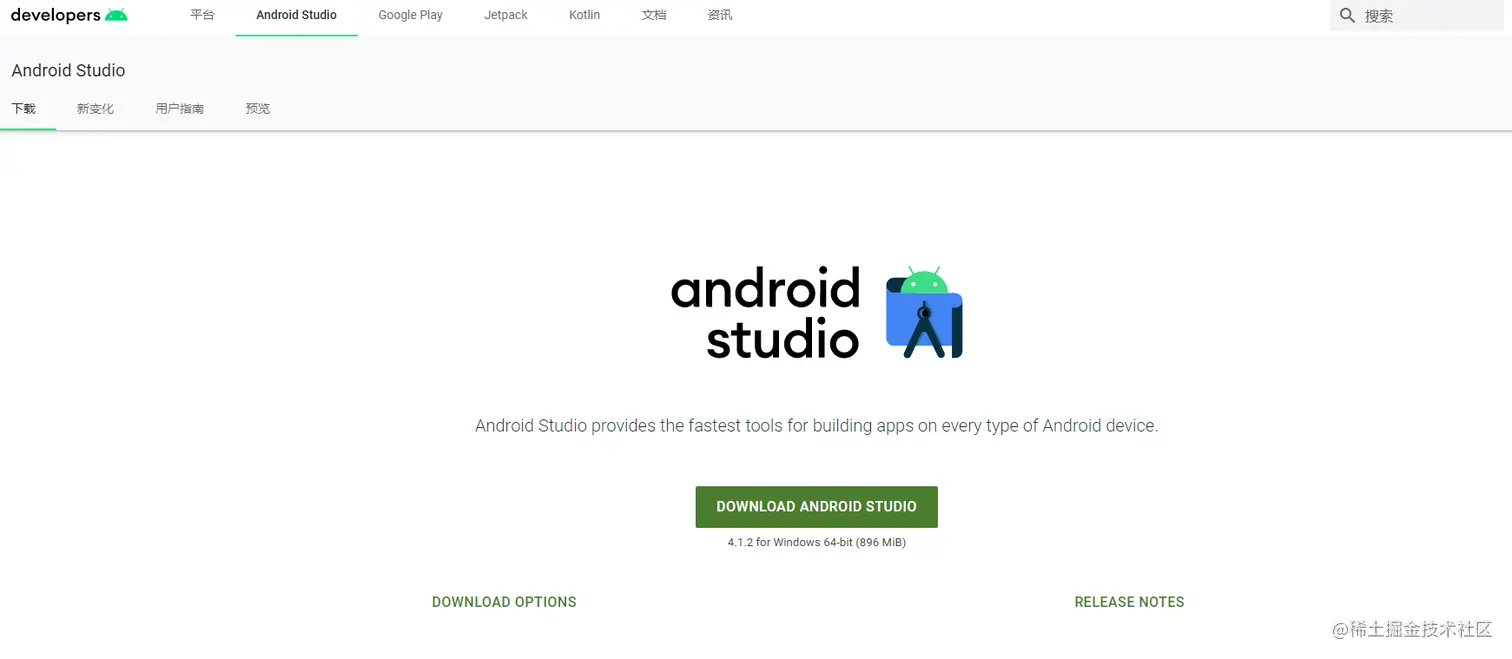 以前安装Android Studio 都用的是exe安装包,但后来发现很多东西都会存在C盘中,本来C盘放太多东西很不爽,有些东西又贼大, 后面根据网上的简介,以及自己的实践,写下了这样一份指南. 在Android Developer官网中,Android Studio提供了多种形式的下载选项 下图所示的推荐正式版本