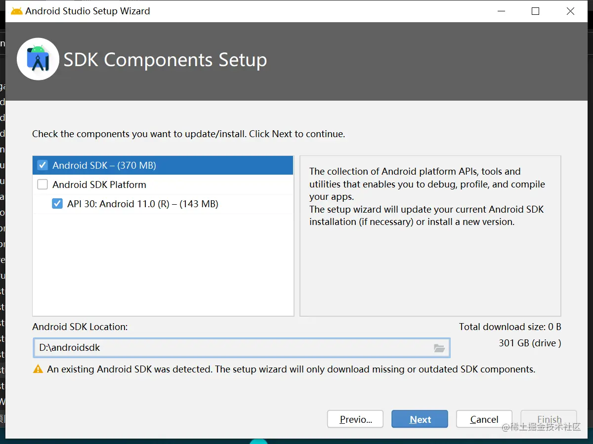 启动后就是配置jdk,sdk路径了,sdk目录可以在自己的盘符建一个目录,然后指向这个目录即可
