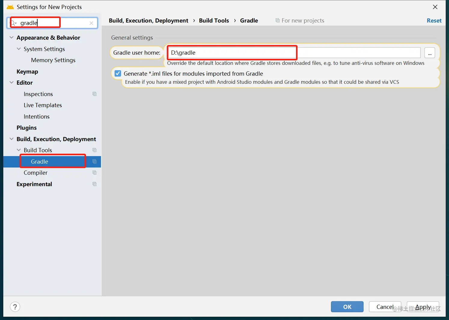 在搜索栏中搜索gradle,更改默认的gradle路径,图中是我自己配置好的路径