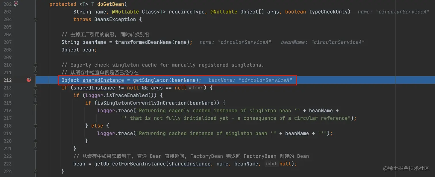 添加断点 beanName.equals("circularServiceA")