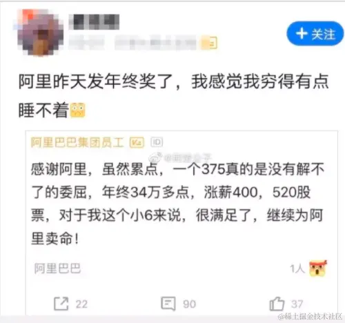 之前逛职场论坛脉脉的时候,看到一个帖子:昨天发年终奖了,我感觉我穷得有点睡不着,里面配了一张图,图里是某位阿里员工晒出的年终奖金额。