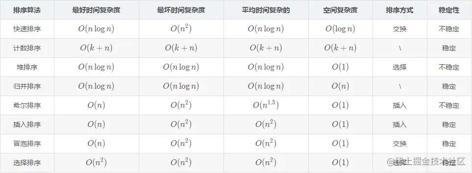 - 平均时间O ( n log n ) O(n \log n)O(nlogn)方法优缺点要明确:快排速度最快,但可能出现较慢情况,不稳定;归并稳定且可用于外部排序,但消耗空间大;堆排序适用于排前k个,不稳定