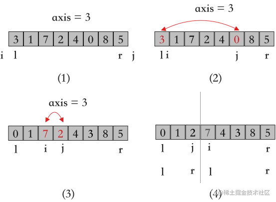 原理:选择一个轴元素key,通过i j ijij指针定位元素,将待排序数组分为左侧小于等于key和右边大于等于key两组,递归操作。