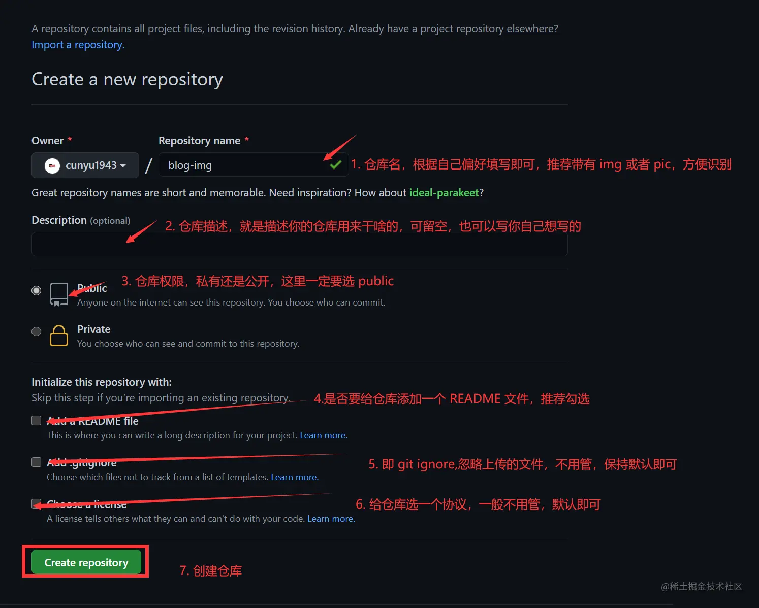 - 填写仓库先关资料,一般只需要选一个合适的仓库名,然后确保仓库为