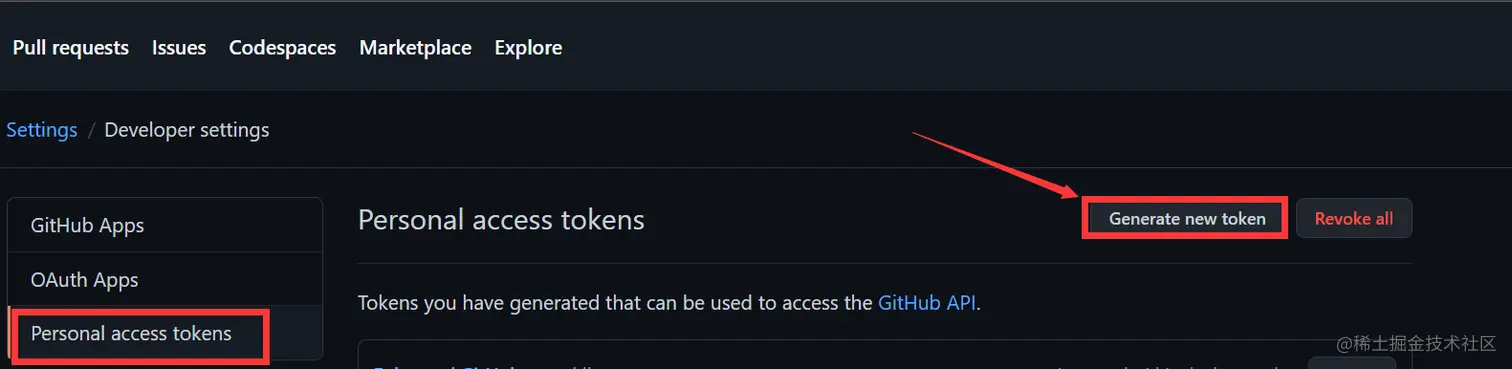 以此打开 Settings -> Developer settings -> Personal access tokens,最后点击 generate new token;