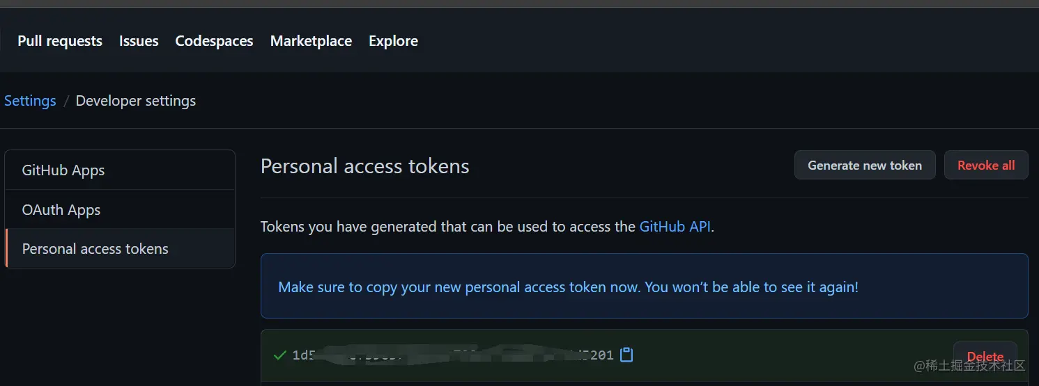 token生成,注意它只会显示一次,所以你最好把它复制下来到你的备忘录存好,方便下次使用,否则下次有需要重新新建;