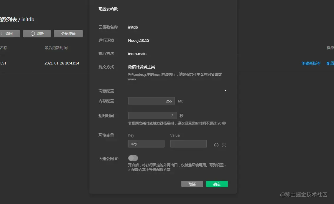 - 云函数默认超时时间为3秒,超过了这个时间则报超时错误。可以在云控制台,设置新值。