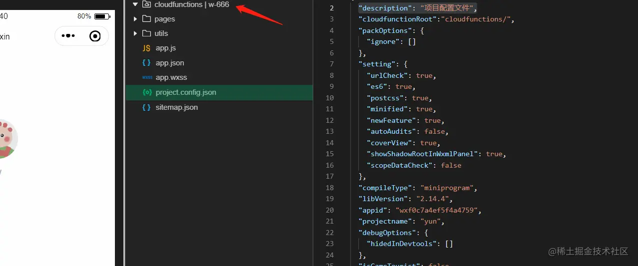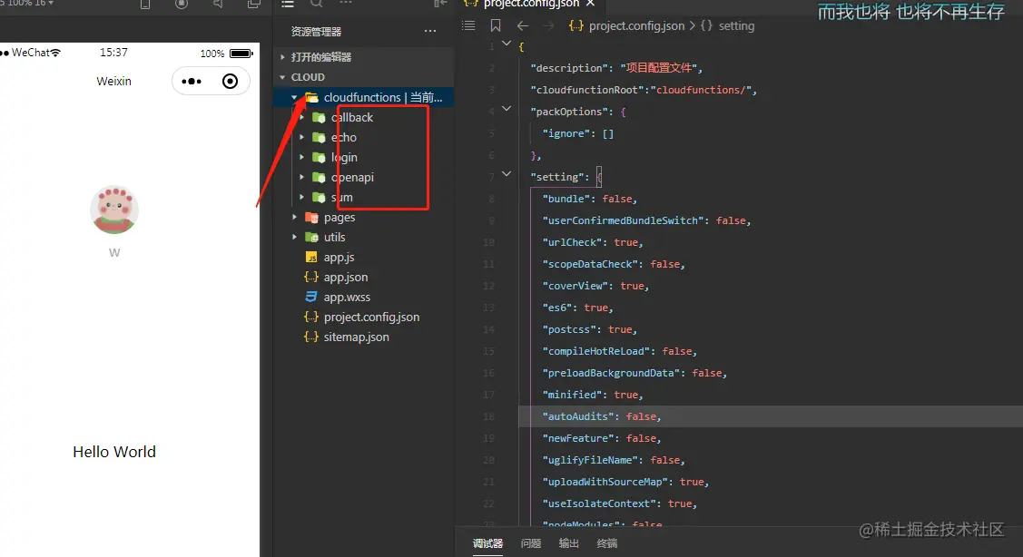 - 在project.config.json文件中添加上这句代码,添加完成后。可以看到cloudfunctions目录出现绑定了哪个云服务名字