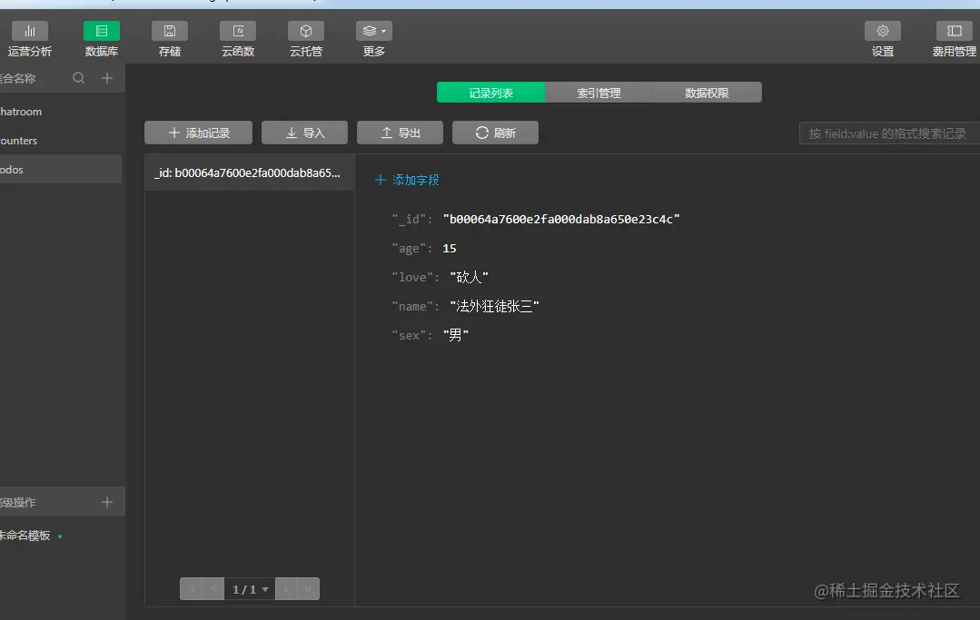 - 小程序云开发提供的是一个json数据库,可以在云控制台中操作数据库。