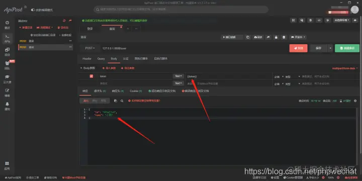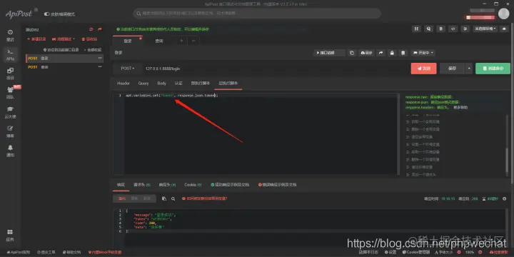 查询接口需要获取登录返回的token值,我们可以在登录的后执行脚本中编辑设置一个环境变量或者全局变量获取动态的token值。
