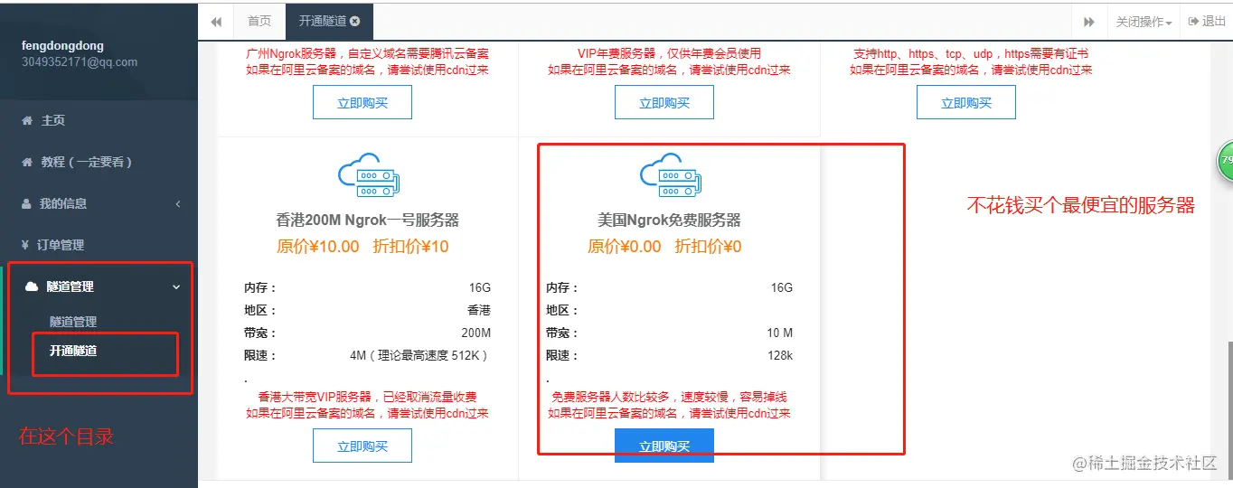 第二步:去买个隧道,选择你想要的版本,这里使用的是免费的。
