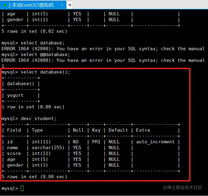 - 在本地虚拟机mysql上创建一个库yogurt,并在里面创建一张student表