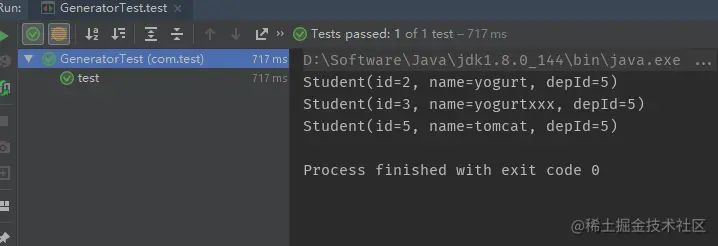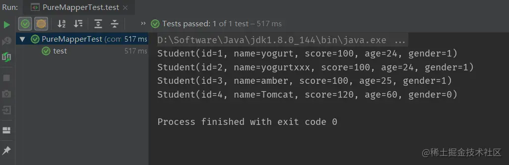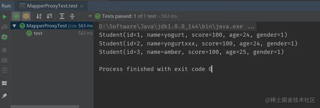 public class SimpleTest { private StudentDao studentDao; @Before public void init() throws IOException { studentDao = new StudentDao("mybatis-config.xml"); } @Test public void insertTest() { Student student = new Student(); student.setName("yogurt"); student.setAge(24); student.setGender(1); student.setScore(100); studentDao.addStudent(student); } @Test public void findAllTest() { List<Student> all = studentDao.findAll(); all.forEach(System.out::println); } }
