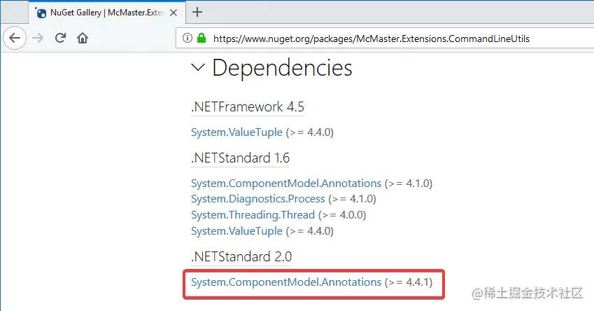 如果我们查看McMaster.Extensions.CommandLineUtils NuGet页面,我们会发现,它又依赖于一些包,其中之一是System.ComponentModel.Annotations。