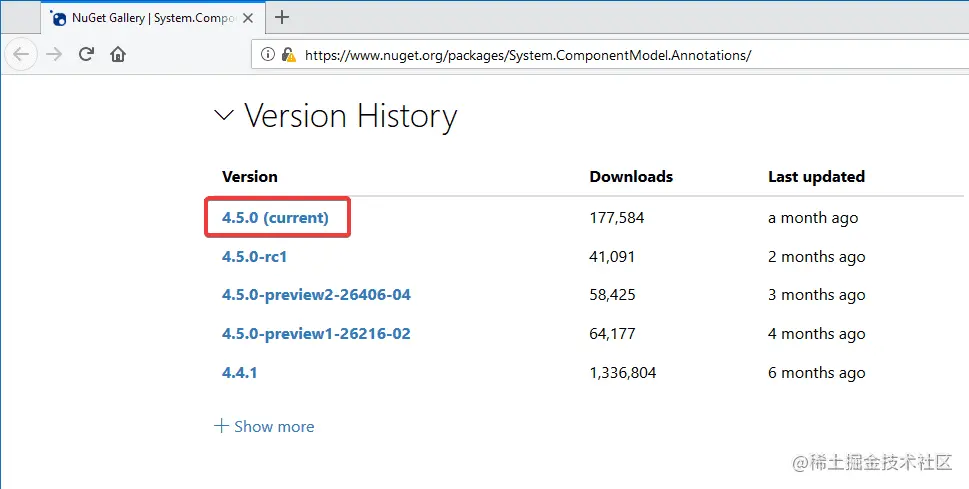 如果我们查看System.ComponentModel.Annotations的NuGet页面,我们会看到该包的一个较新的版本。