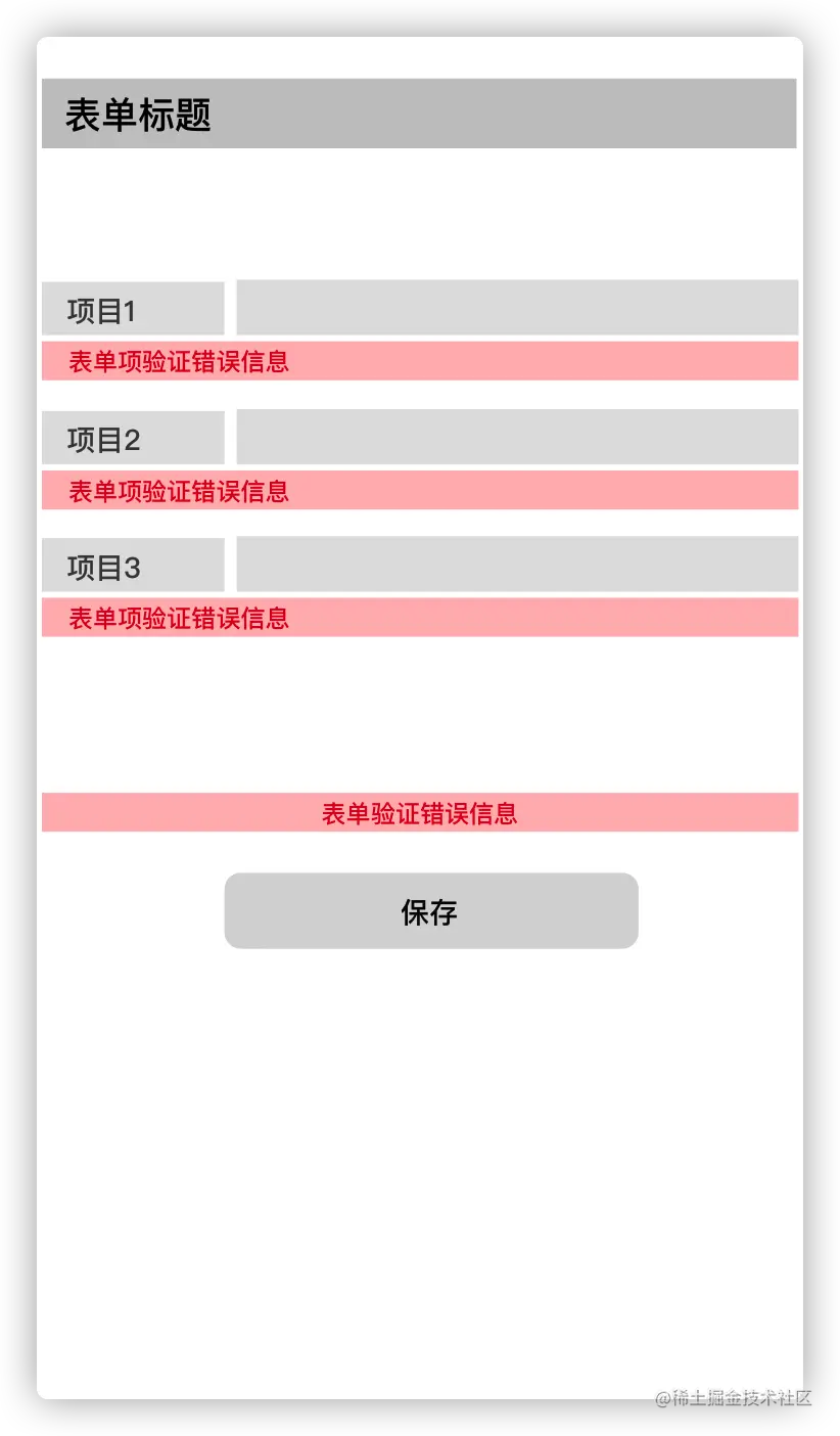 表单界面细致的可以分为几个部分:表单标题,表单项,表单项错误提示,表单错误提示,保存按钮。此外还会有一些例如表单用途简略描述等其他辅助要素。