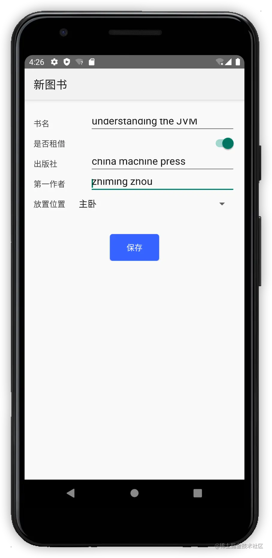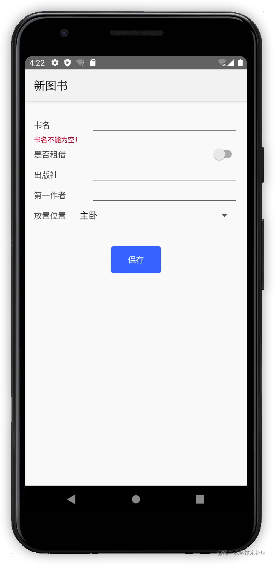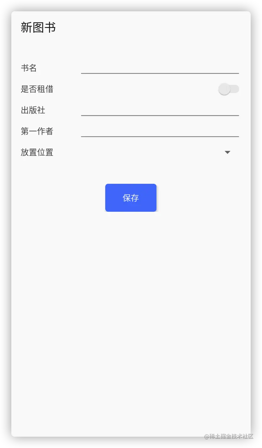 表单数据通常指MVVM中的Model。但是对Model的定义,其实在行业里还是有争议的。有两种方面解释:一种model只是代表有用的需要存储的业务数据,另一种model不仅包含数据而且还包含交互过程中界面的一些状态。而这里表单数据特指第一种。小白将表单数据和交互的状态数据分离节藕,一是方便独立维护表单数据,不会形成互相干扰。二是通常业务数据会携带一些隐藏数据,比如版本控制信息等,这些信息会很容易和交互的状态数据混淆,独立的表单数据,更加安全,不容易造成数据错误,也方便提交和保存尤其是数据持久化。所以小白在这里只需要定义一个Book的数据实体类:
