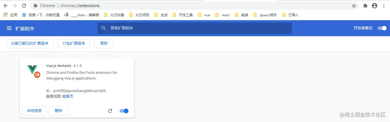 点击加载已解压的扩展程序, 找到刚才生成的chrome文件夹,选择 vue-devtools > shells > chrome 放入, 安装成功如下图
