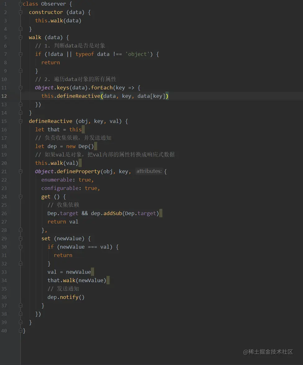 let vm = new Vue({ el: '#el' data: { o: 'object', dog: { name: '' } }, method: { clickHandler () { // 该 name 属性是否是响应式的 this.dog.name = 'Trump' } } })