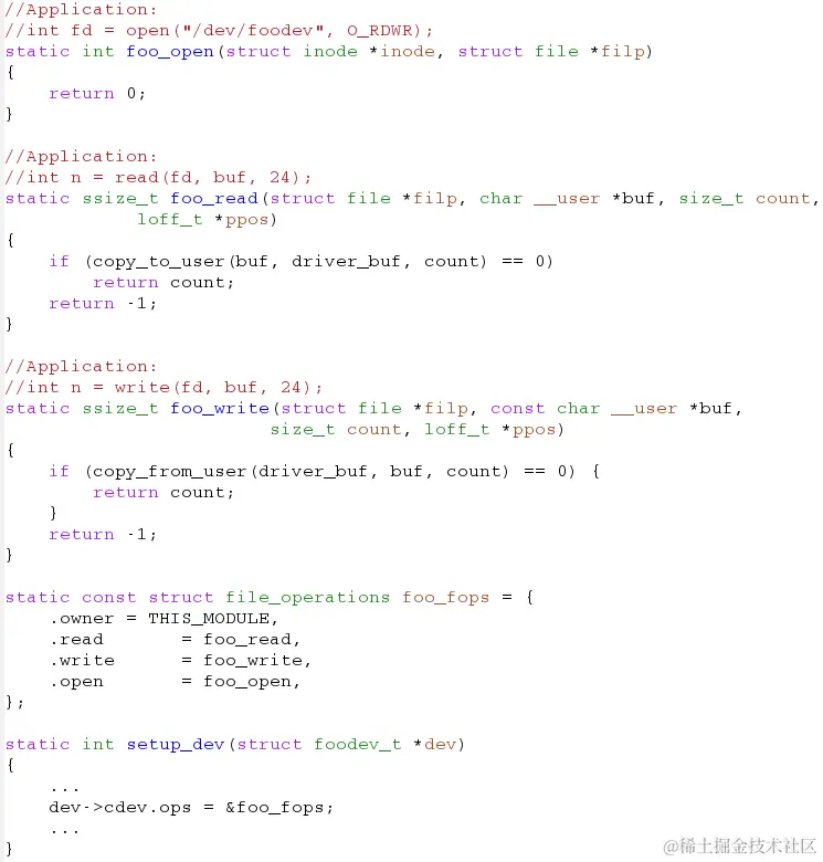 - 驱动调用 foo_read/write并使用copy_from/to_user来交换数据。