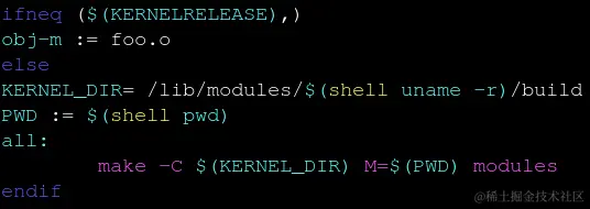第一次运行make的时侯,$(KERNELRELEASE) 为空,因此,Makefile的 'else' 内容首先被读取,然后,执行 *‘make -C .....’*, 执行过程中,会回读Makefile文件,这次, 'ifneq' 条件满足,两次走不同的路径,编译系统配置不同的变量参数。