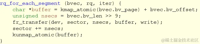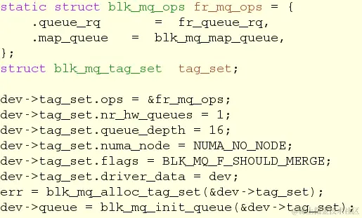 kernel 提供了一些宏来帮助遍历请求列表。对请求的处理策略,就是Block驱动最核心最精华的部分,开发者得根据设备的物理特性来提高访问效率,解决并发拥堵等问题。 *fr_queue_rq()* -- ‘**请求队列’**处理函数,在初始化请求队列时设置,Loop处理每个请求: